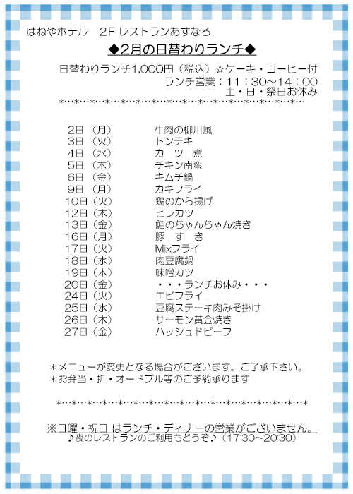 ※日曜と祝日は、ランチ・ディナーは営業しておりませんので、ご了承下さいませ。